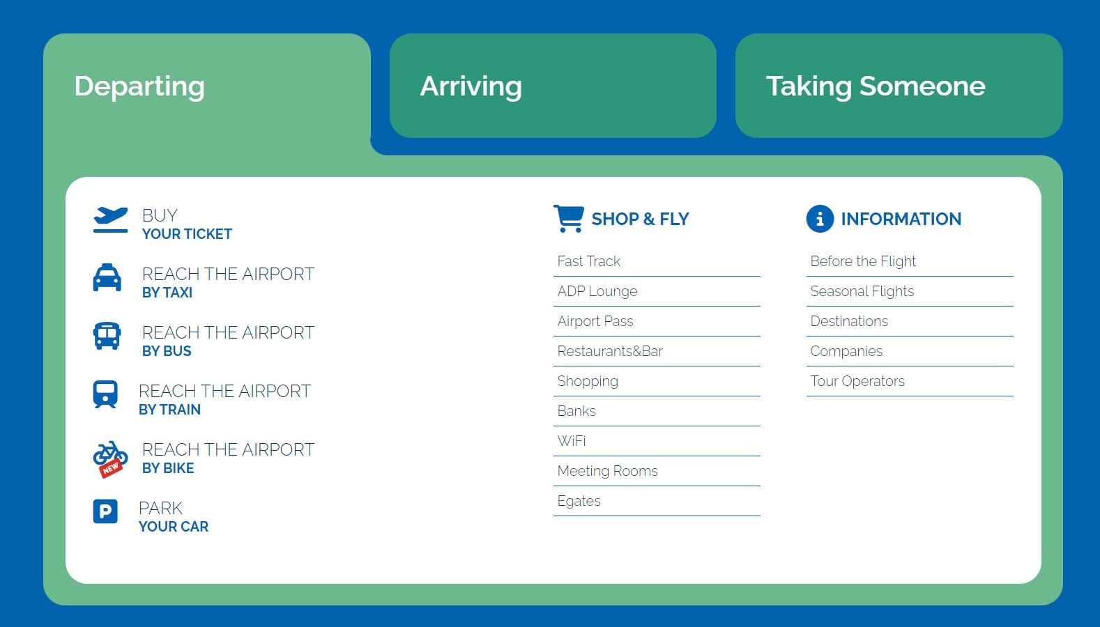 On the Puglia airports website, select “Bari”. Scrolling down you will find the section illustrated in the image below (click here for the direct link) which will give you all the options of public transport available to reach your destination directly from the “Karol Wojtyla” airport of Bari Palese. Without leaving the site, you can purchase all tickets online by selecting your choices.